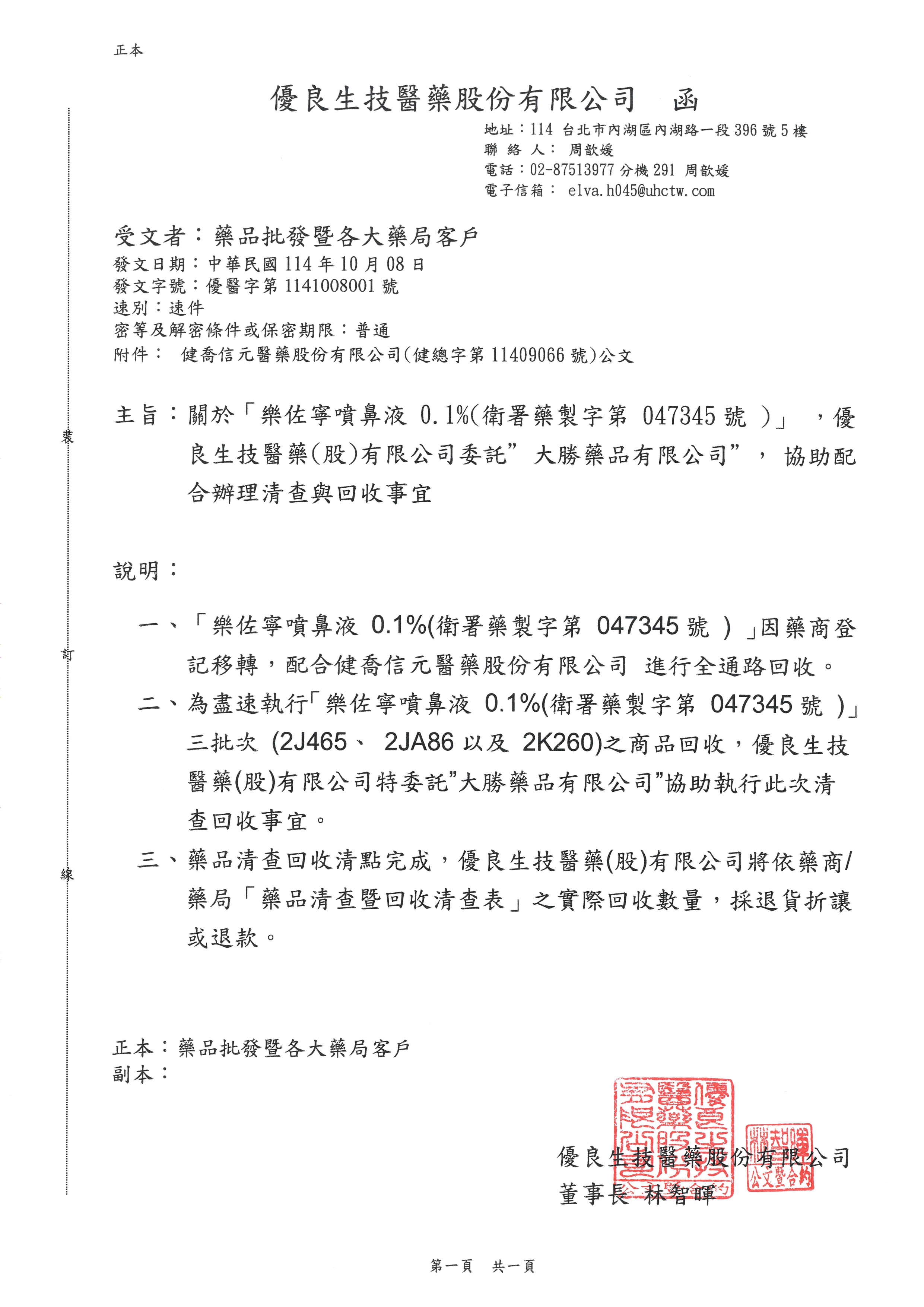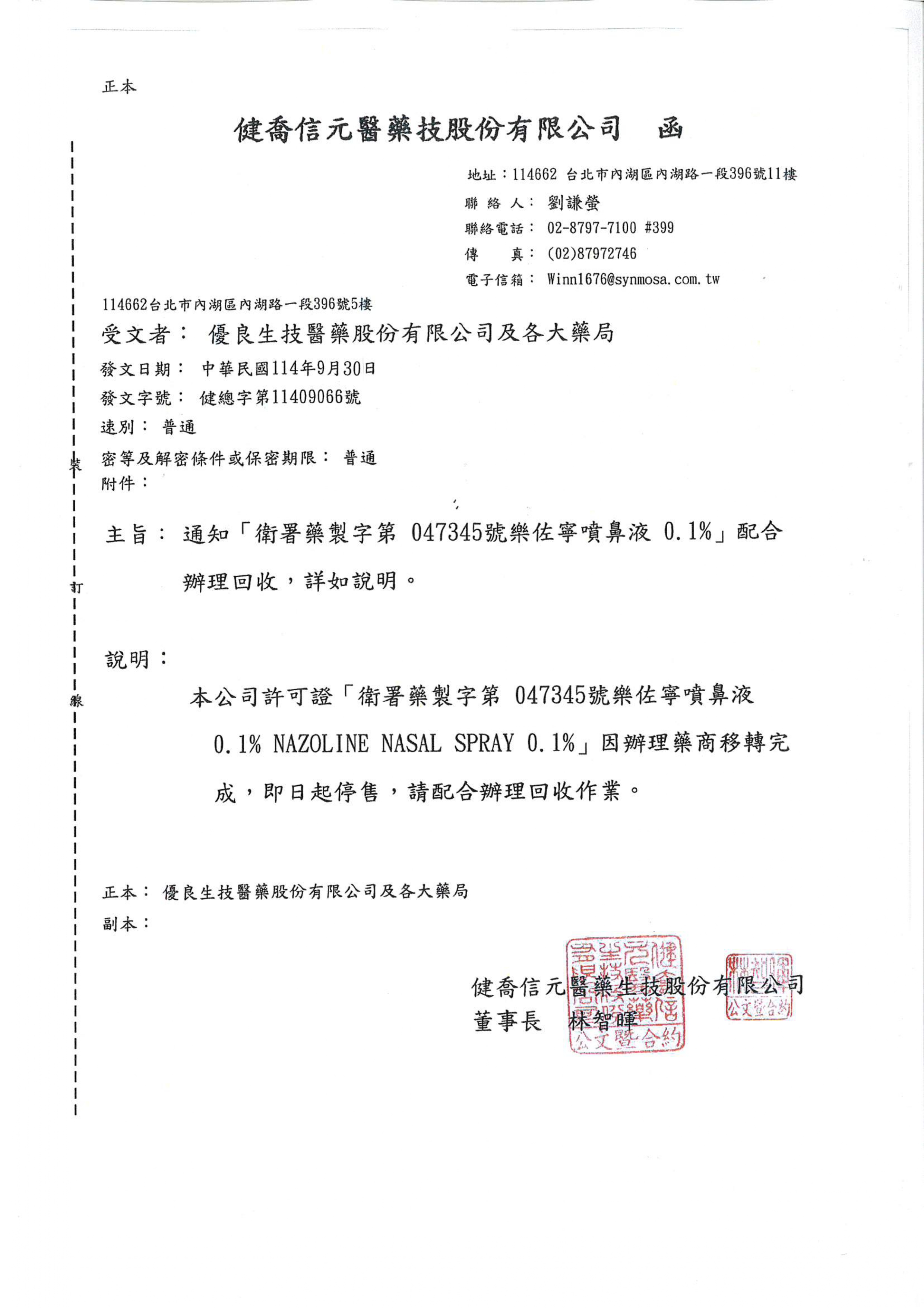 說明:本公司許可證因辦理藥商移轉完成,即日起停售,請配合辦理回收作業。