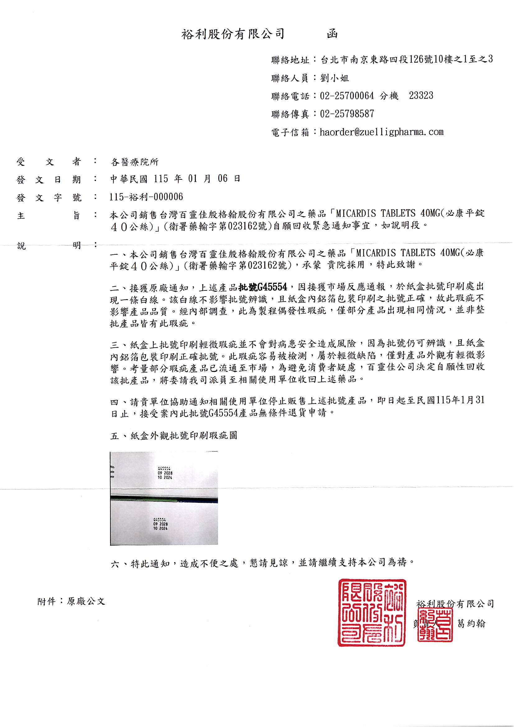 ,紙盒上批號印刷輕微瑕疵並不會對病患安全造成風險,為避免消費者疑慮,百靈佳自願性回收該批號產品