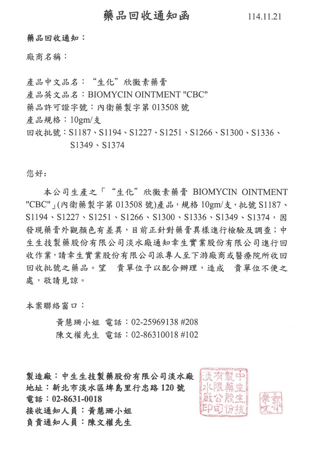 說明:因藥膏外觀顏色有差異,目前針對藥膏異樣進行檢驗及調查,中生生技製藥股份有限公司淡水廠通知幸生實業股份有限公司進行回收