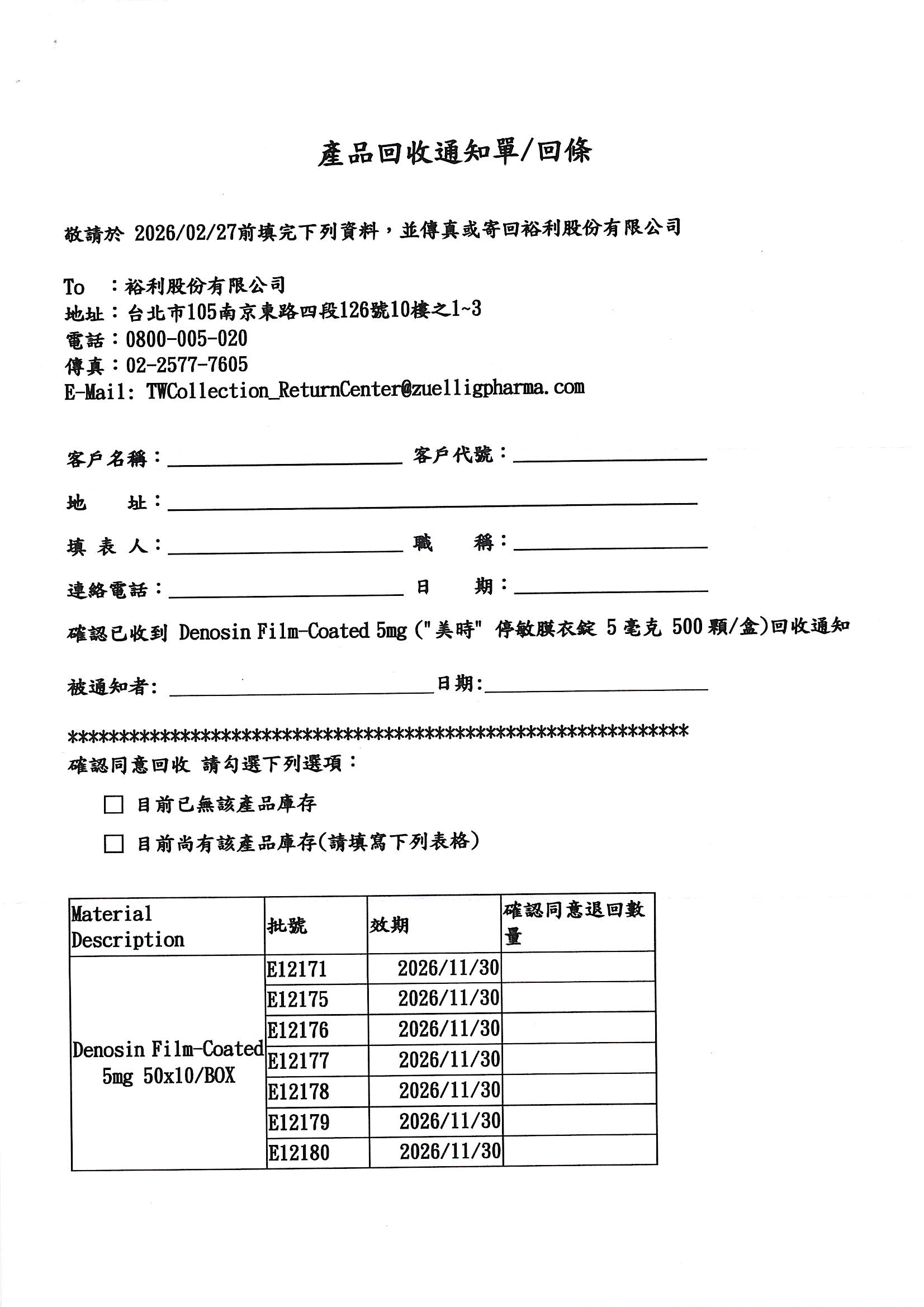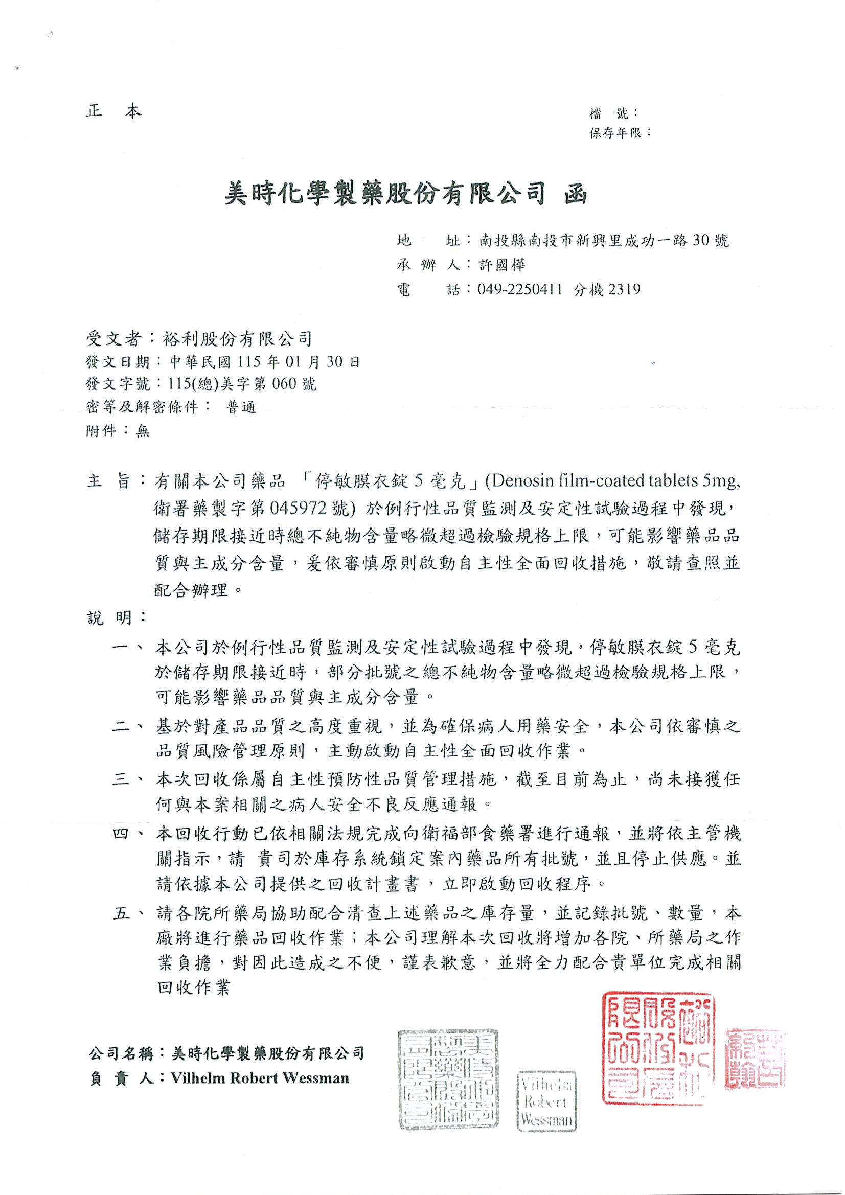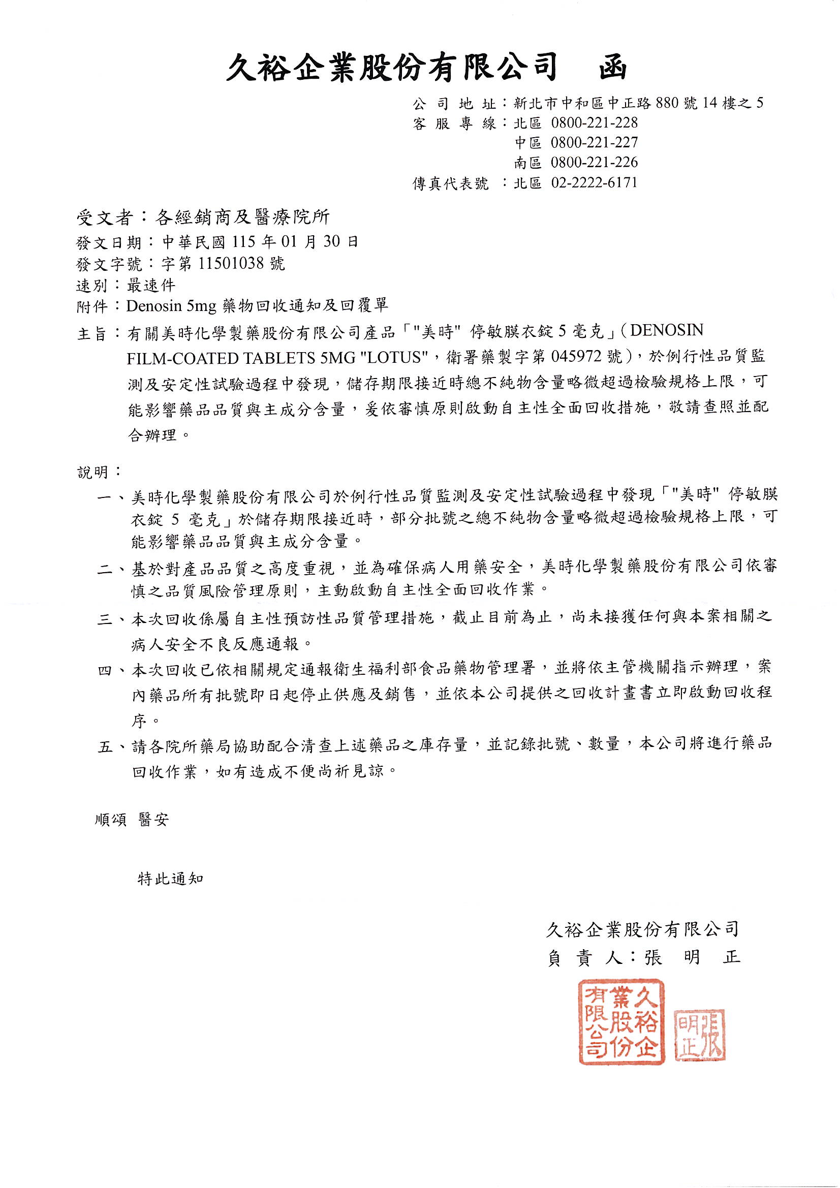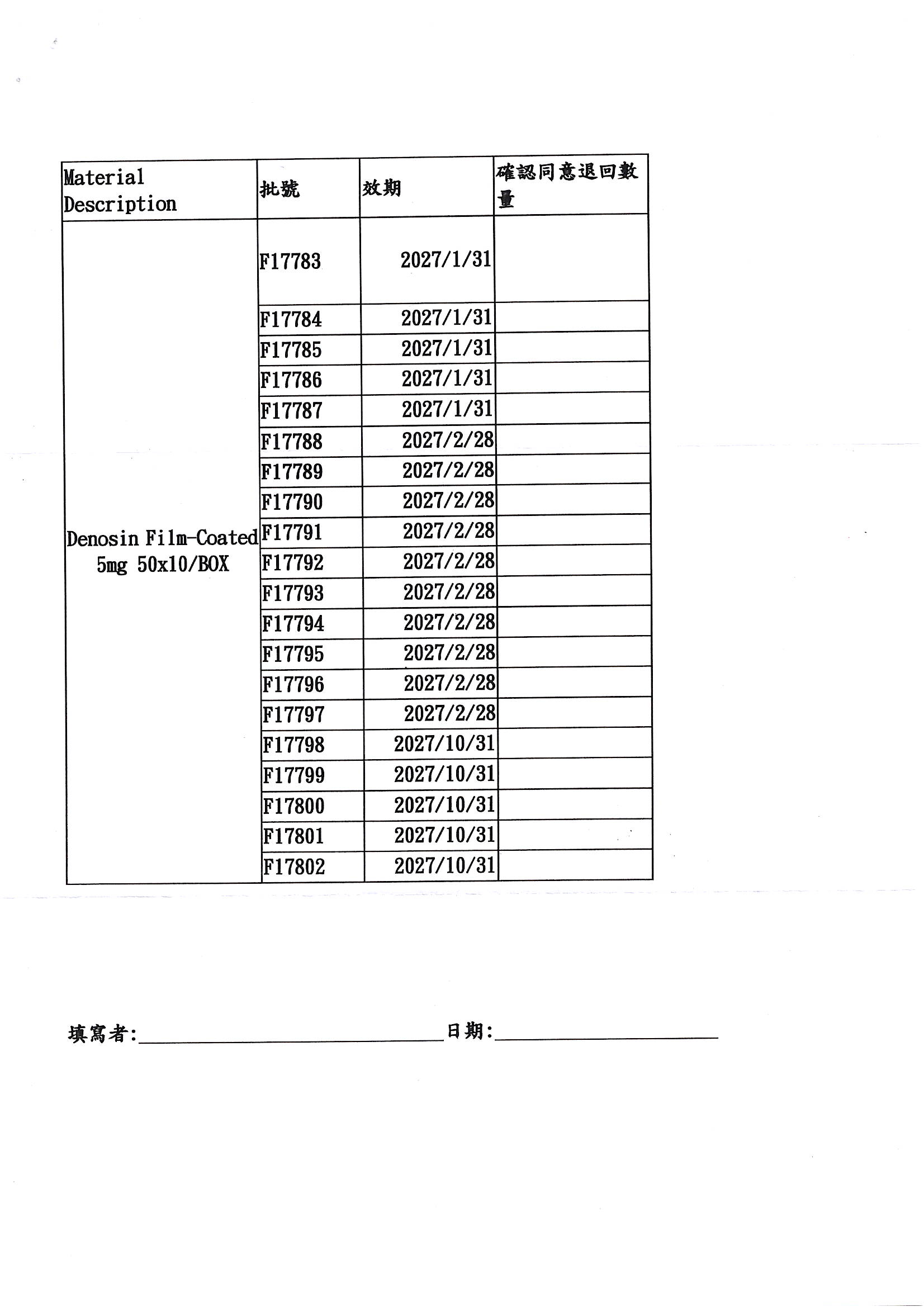 說明:Q001檢測出含有不純物,基於風險考量,回收期限內批號。