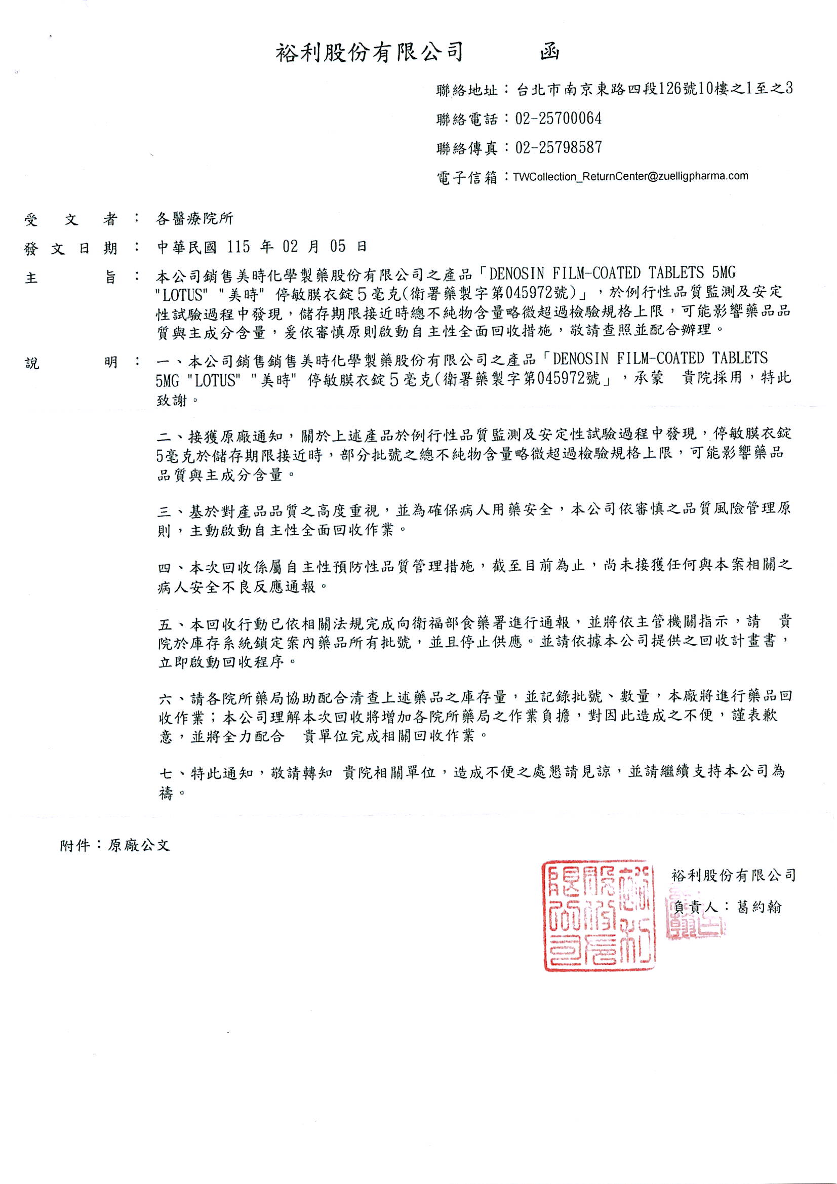 說明:本公司許可證因辦理藥商移轉完成,即日起停售,請配合辦理回收作業。