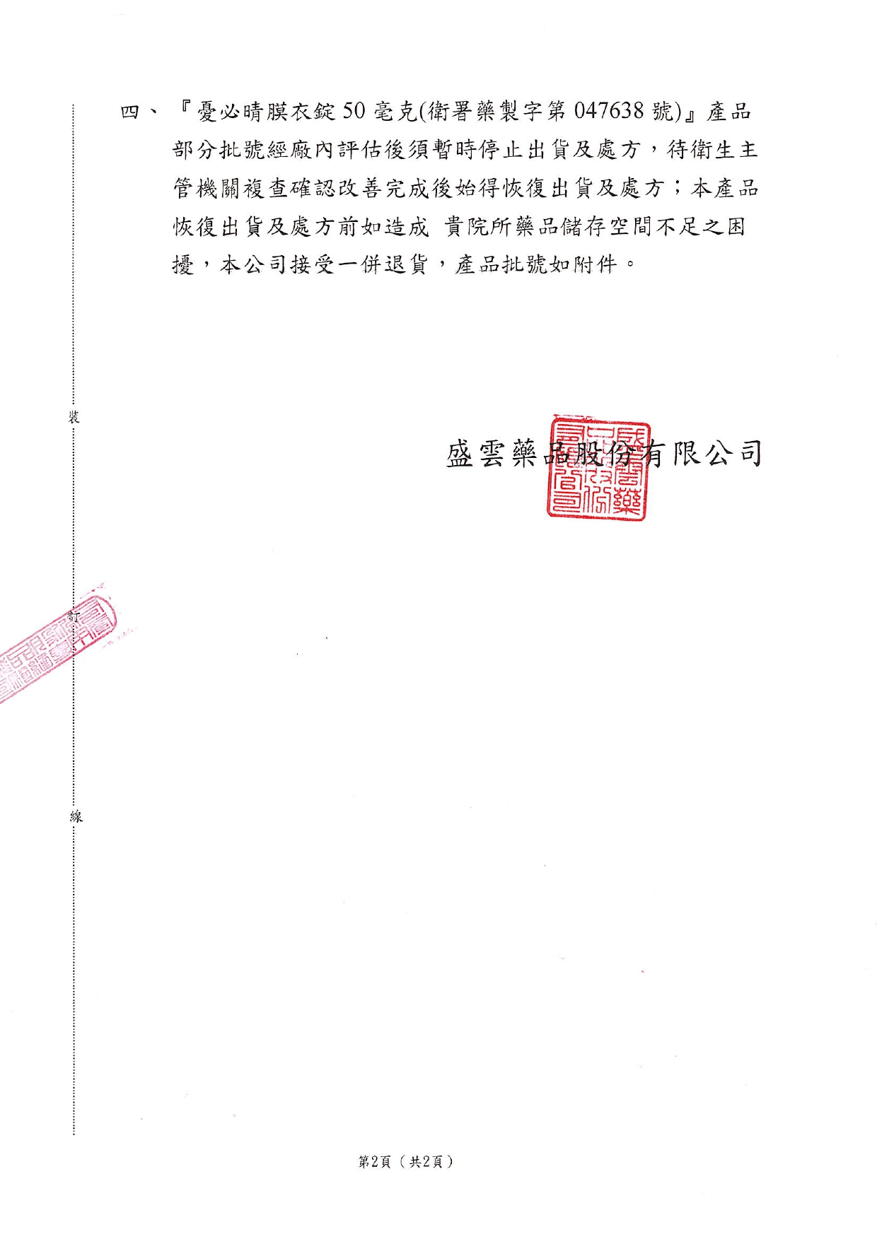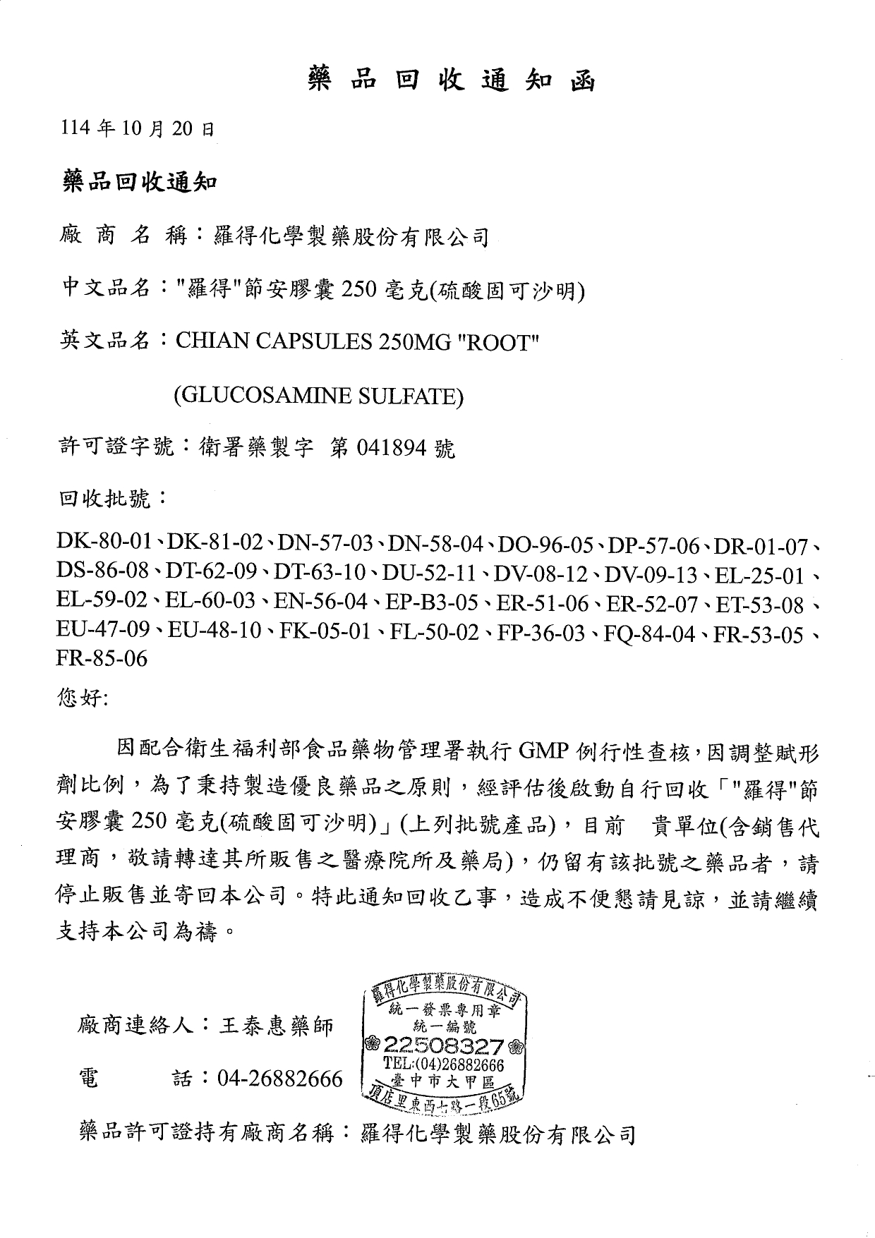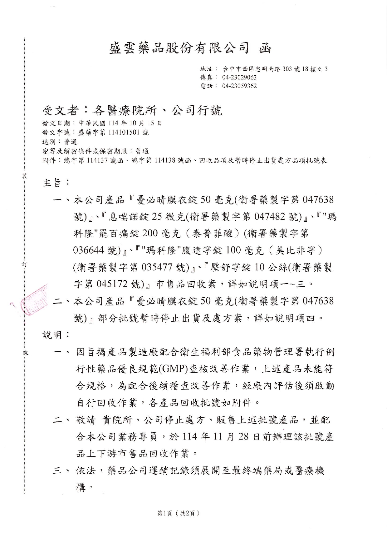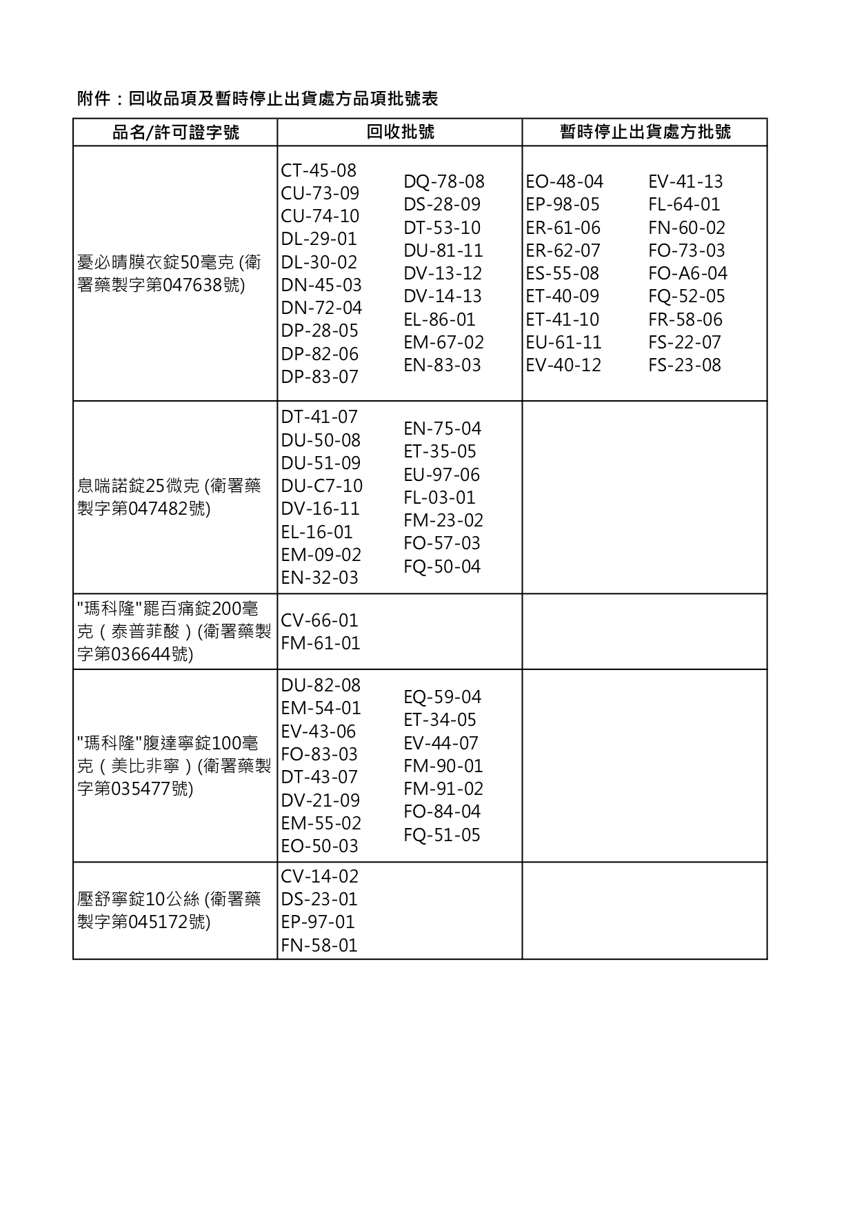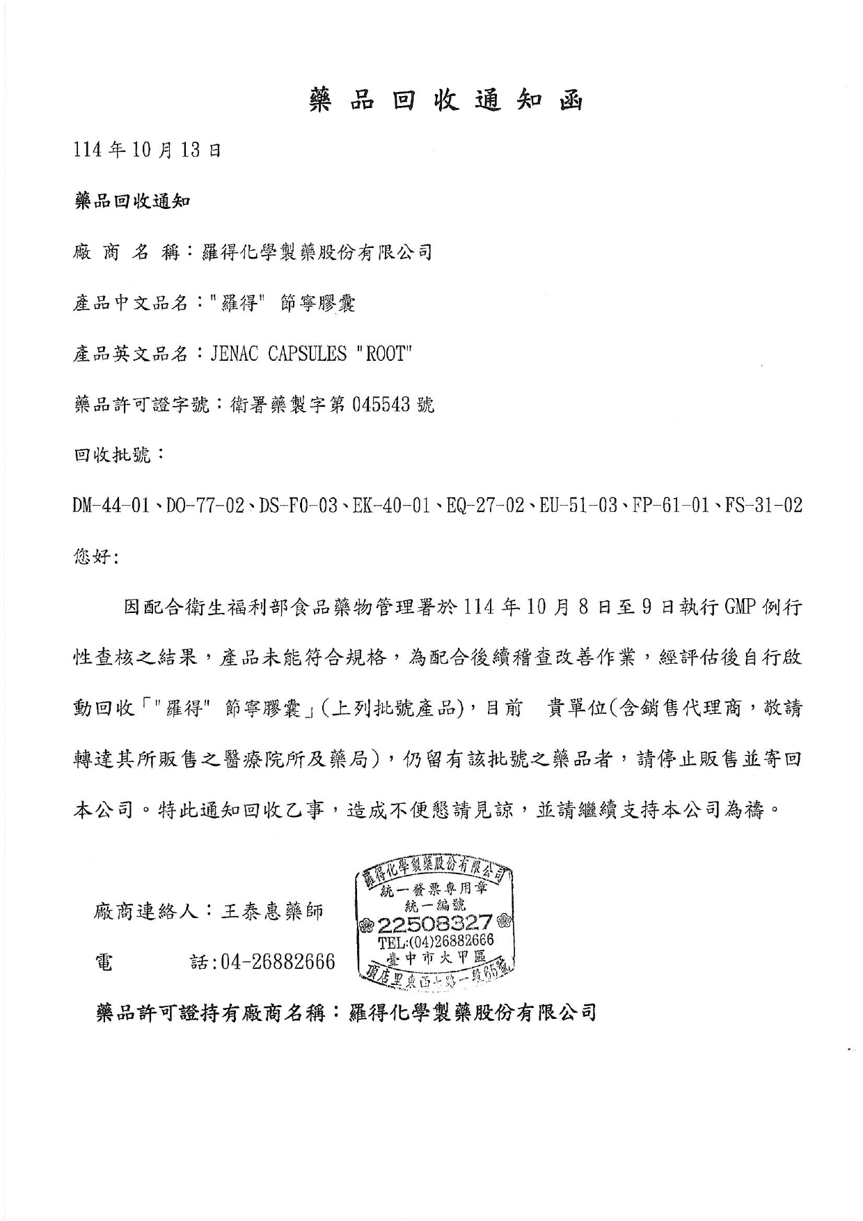 說明:產品部分批號不符合規格,故需要回收。
