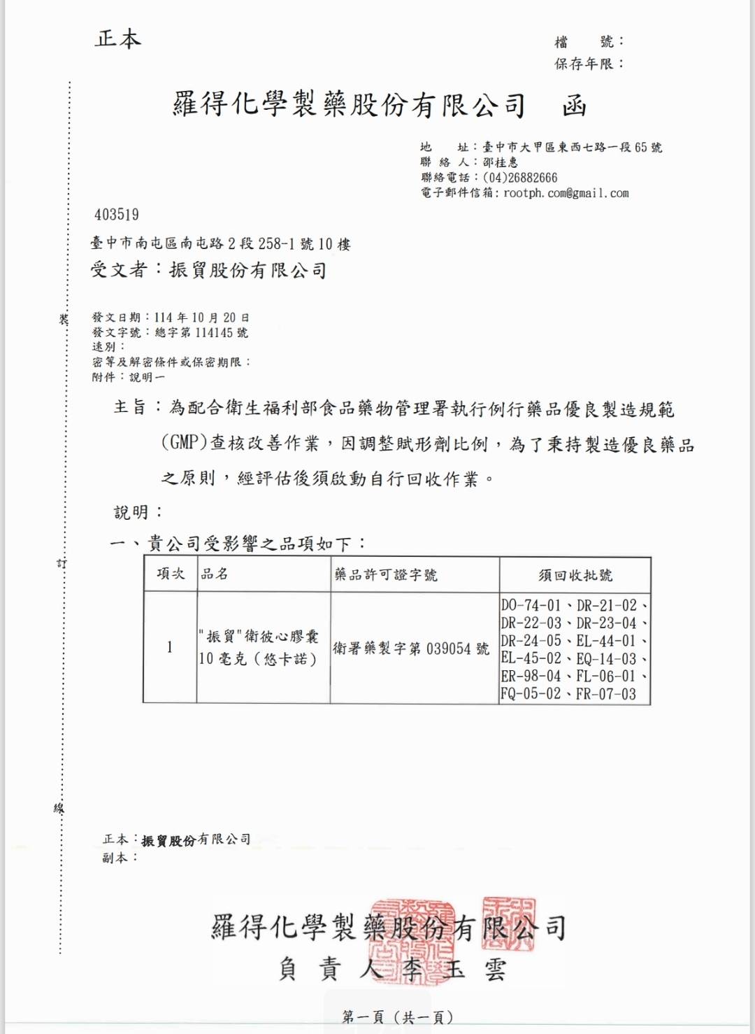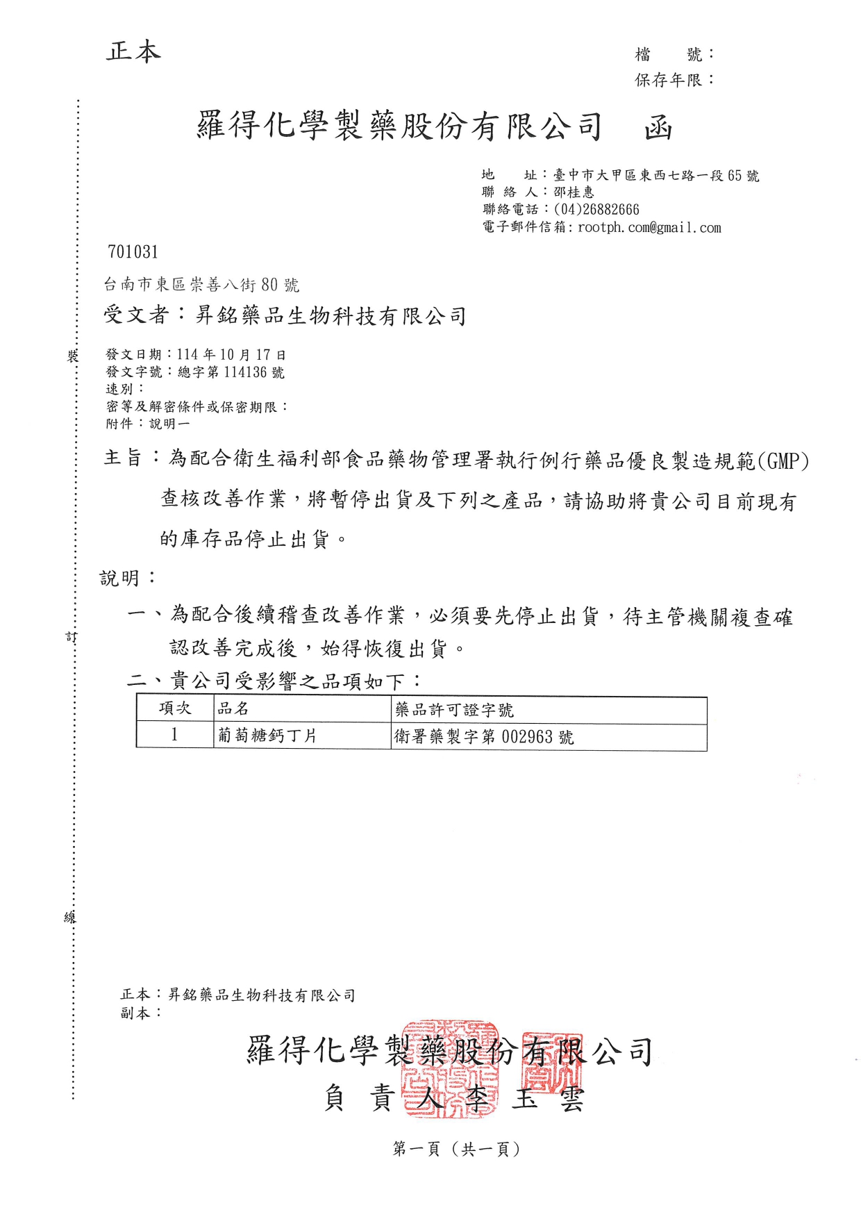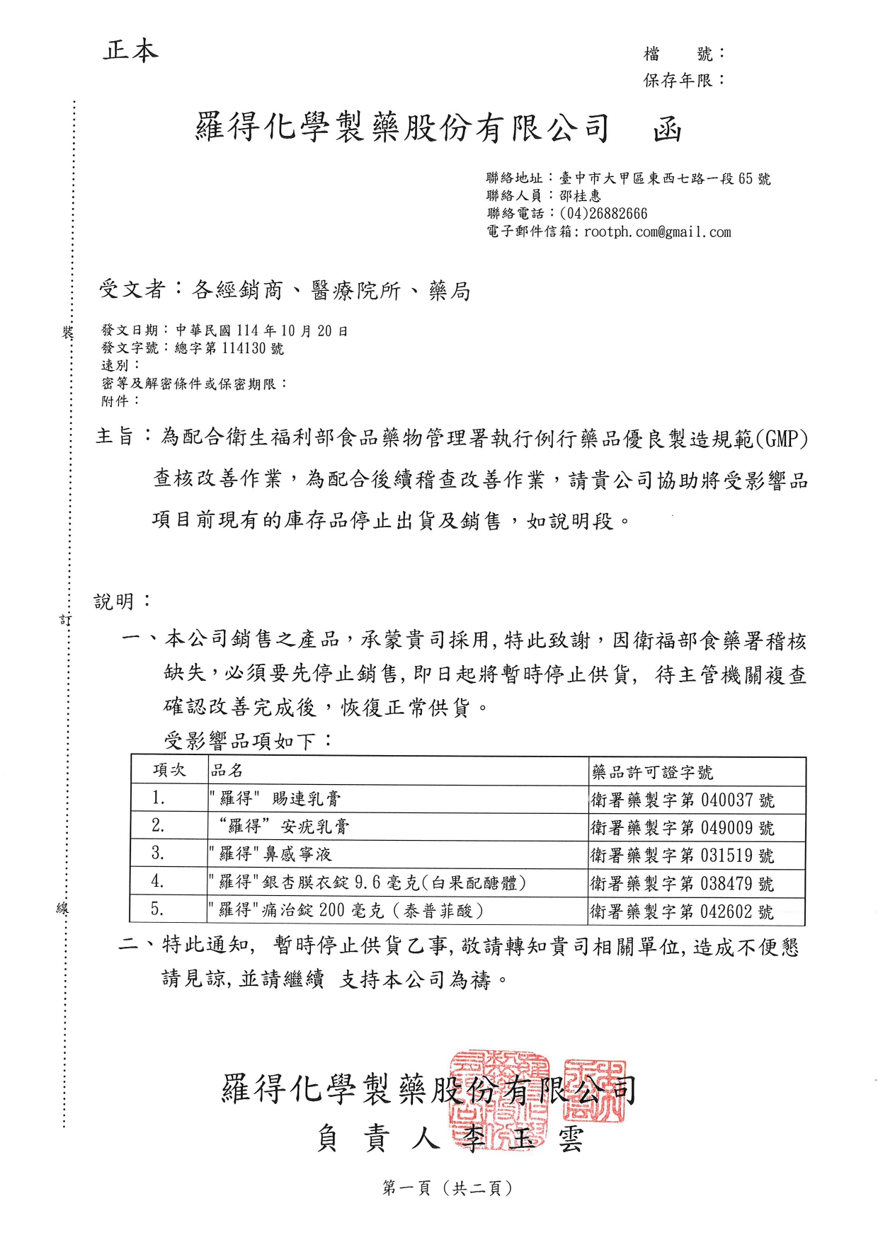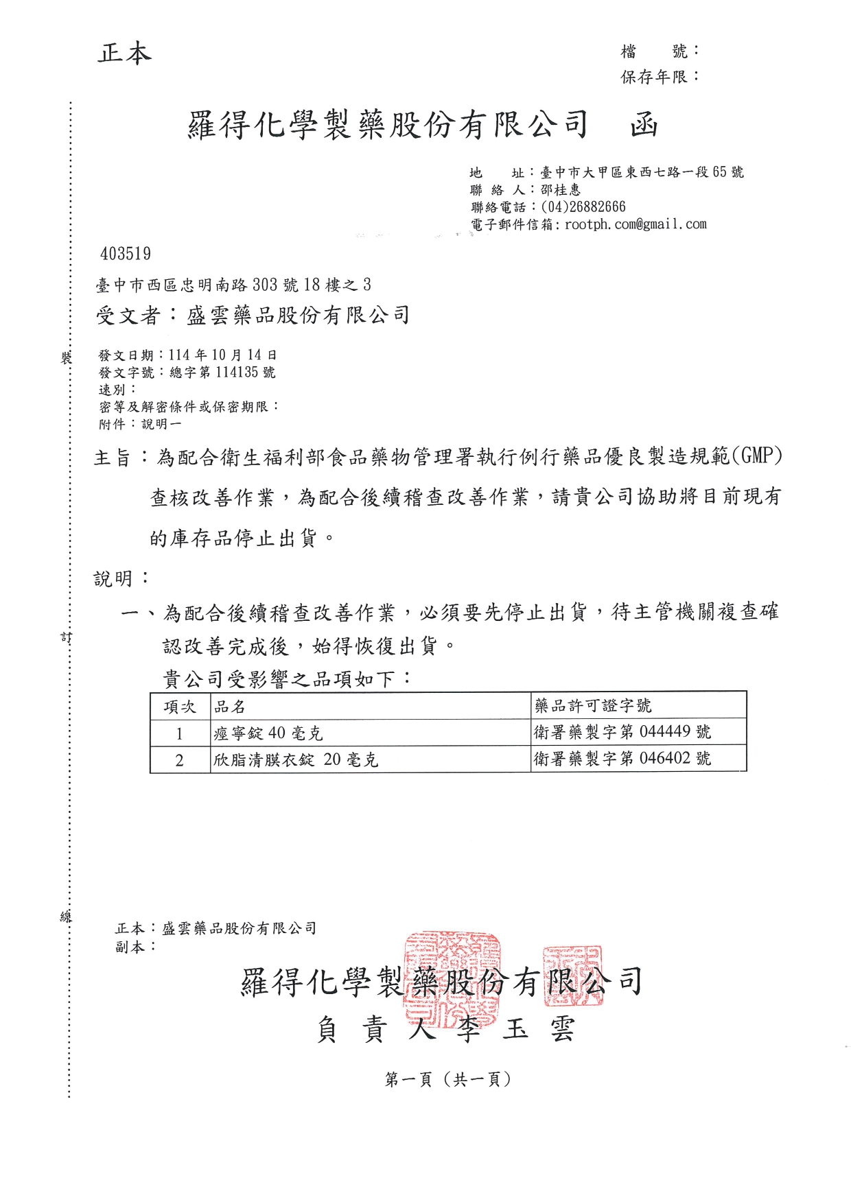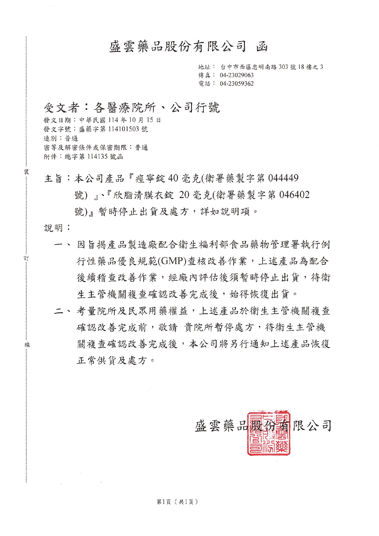 說明:執行例行性藥品優良規範(GMP)查核改善作業,於衛生主管機關複查改善完成前,需暫停出貨及處方,待衛生主管複查確認改善完成後得恢復處方及出貨。